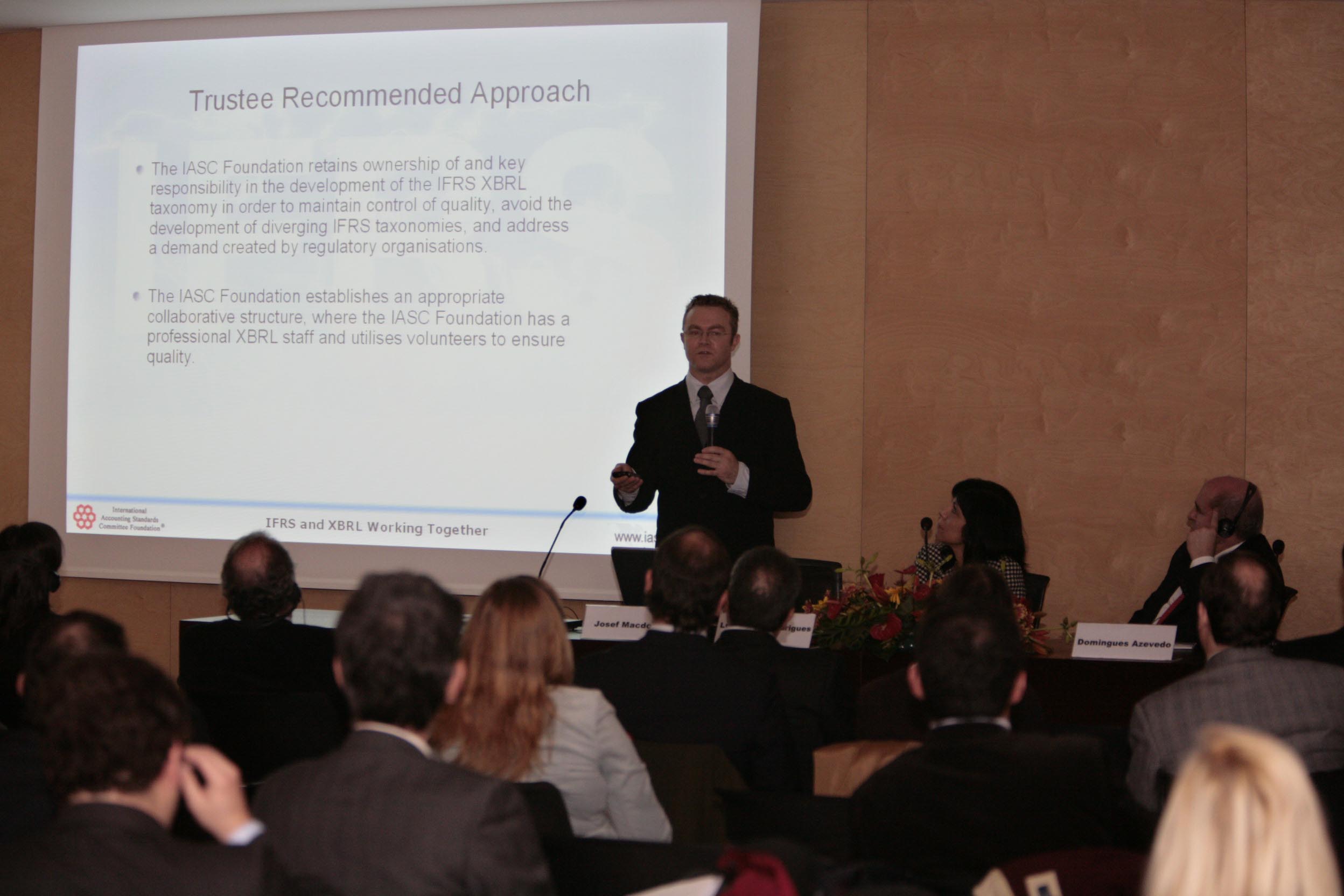 Josef MacDonald, membro do IASB, esclareceu que o XBRL é propriedade da IASCF (International Accounting Standards Committee Foundation) e que, neste momento, se trabalha para a criação de um taxionomia para as PME. Este neozelandês deu exemplos de entidades que usam o XBRL e avançou com a Bolsa australiana, o governo holandês ou até mesmo a Bolsa de Frankfurt, na Alemanha, para garantir que, no seu entender, «Portugal tem excelentes recursos para trabalhar com o XBRL.»
